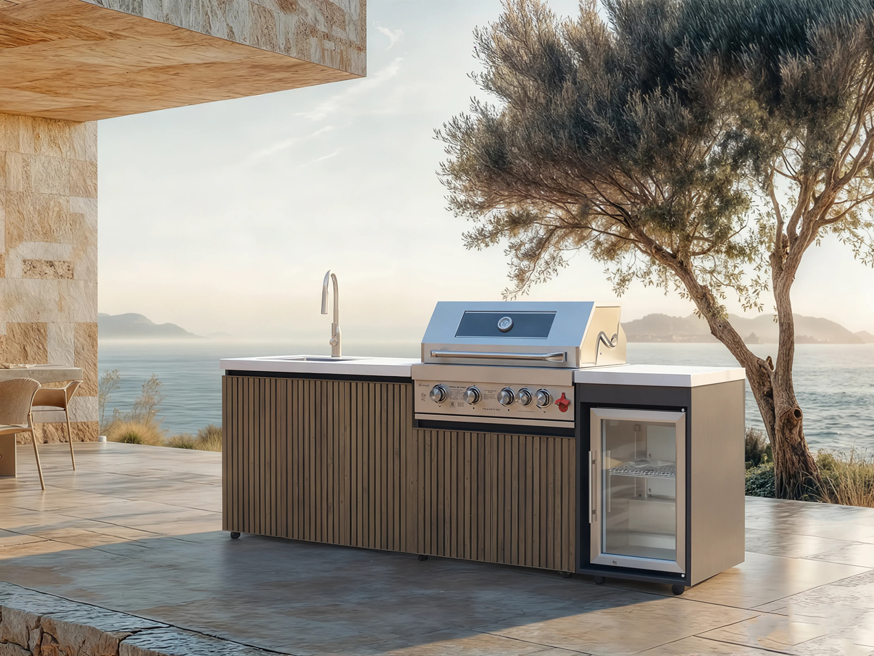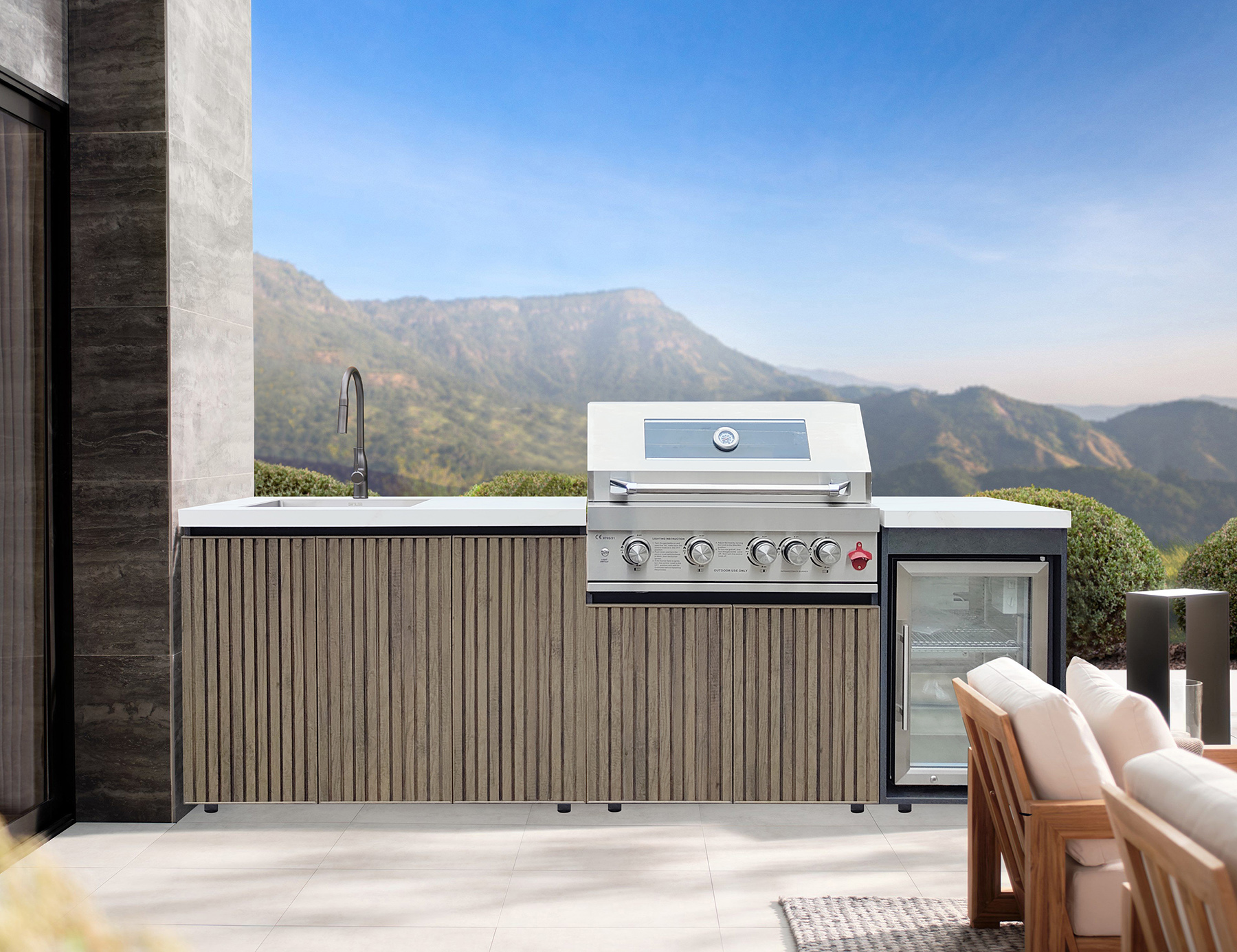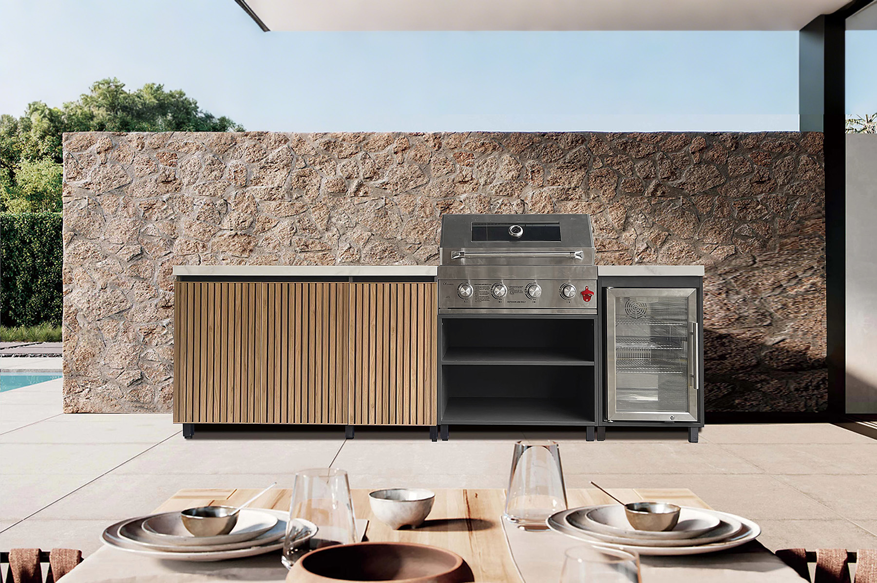 Integrated Refrigerator: A dedicated refrigeration unit is included on the right side, perfect for cooling beverages, storing perishables, and reducing trips indoors.