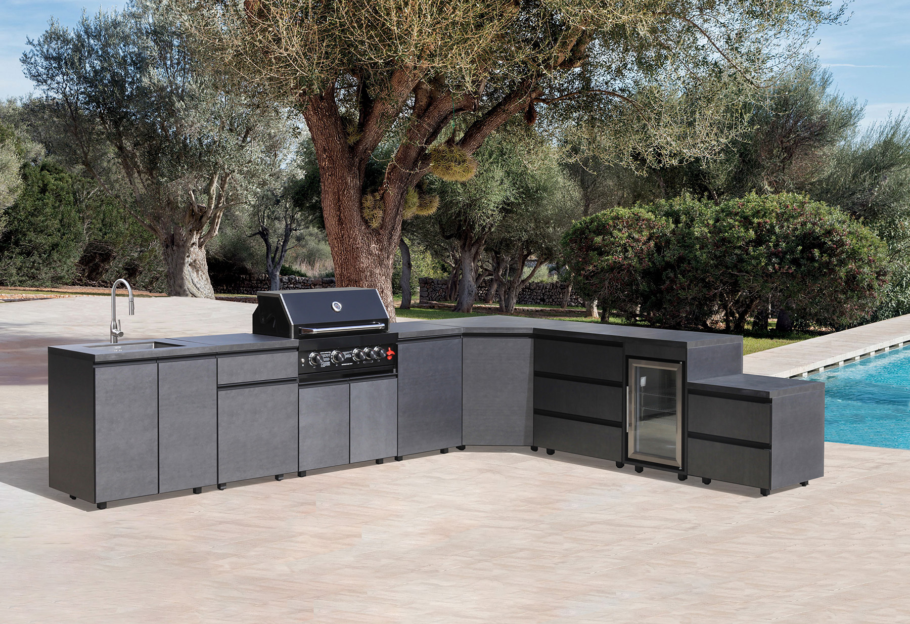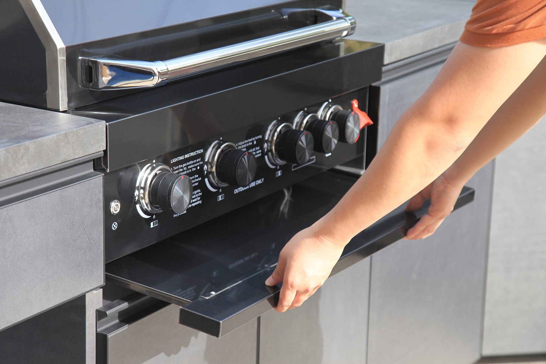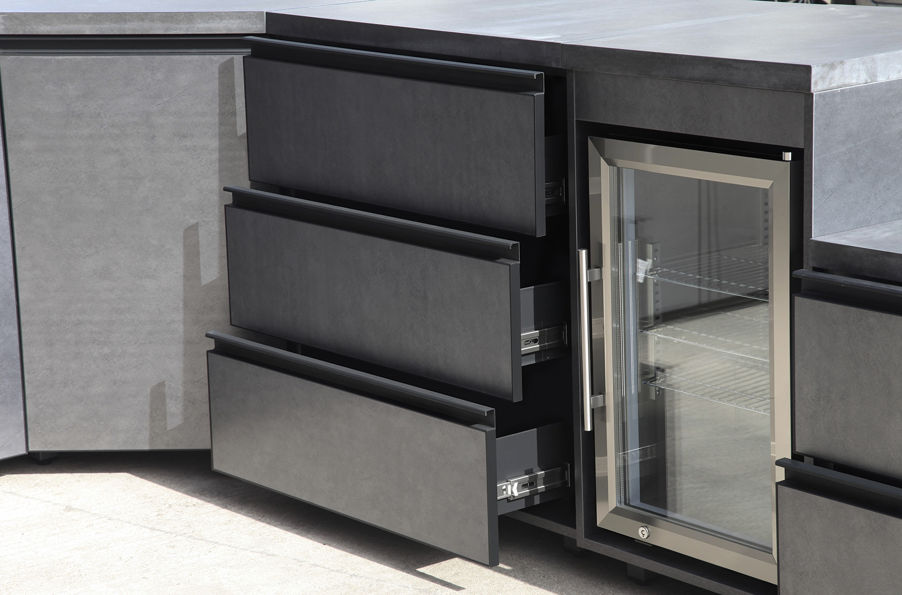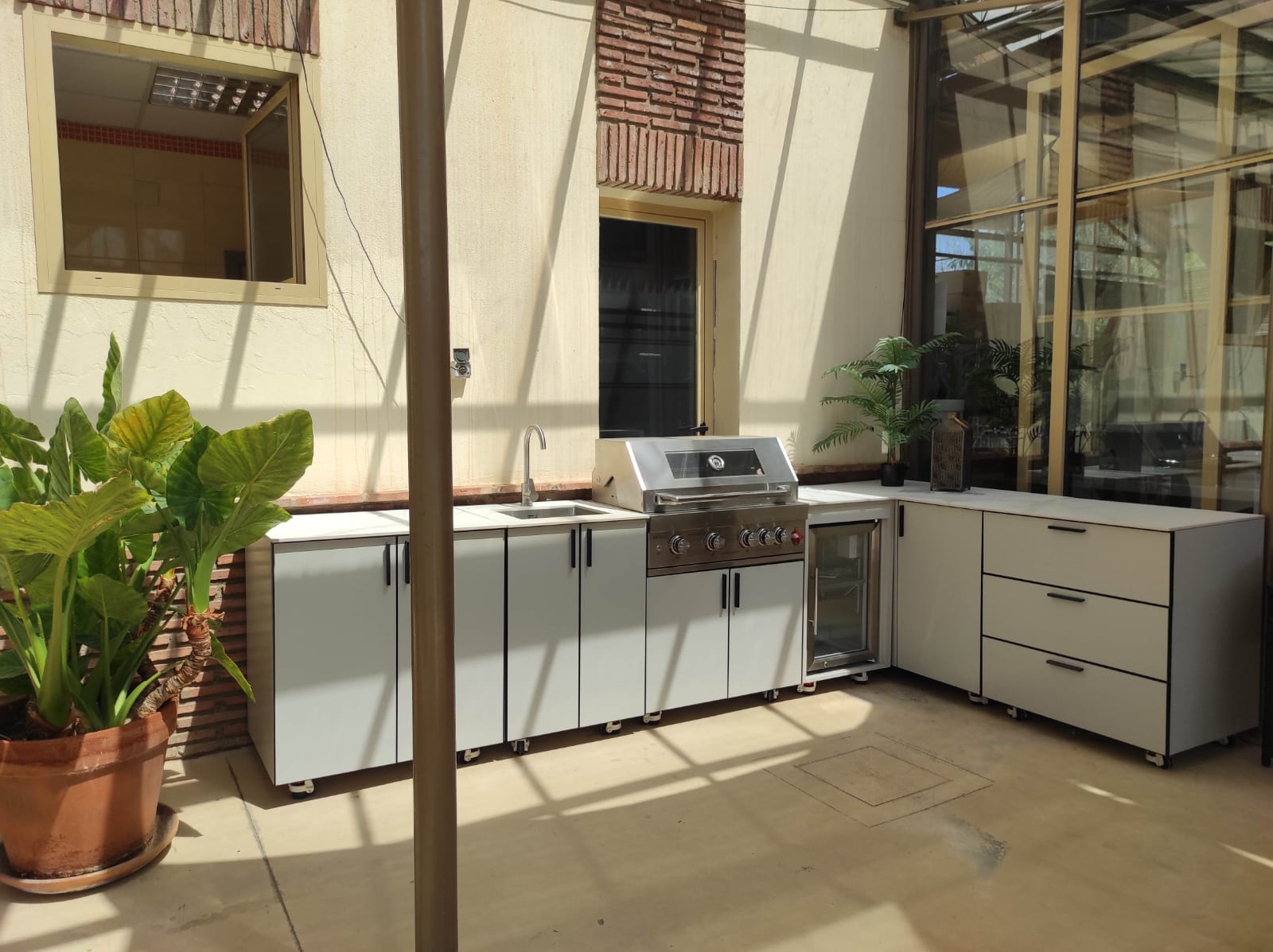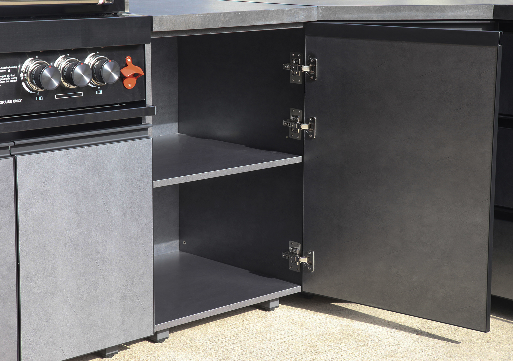 Integrated Refrigerator: A dedicated refrigeration unit is included on the right side, perfect for cooling beverages, storing perishables, and reducing trips indoors.