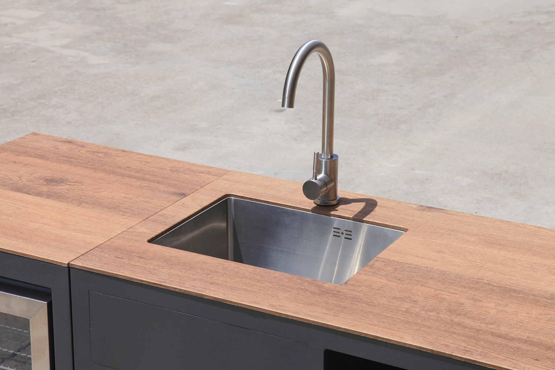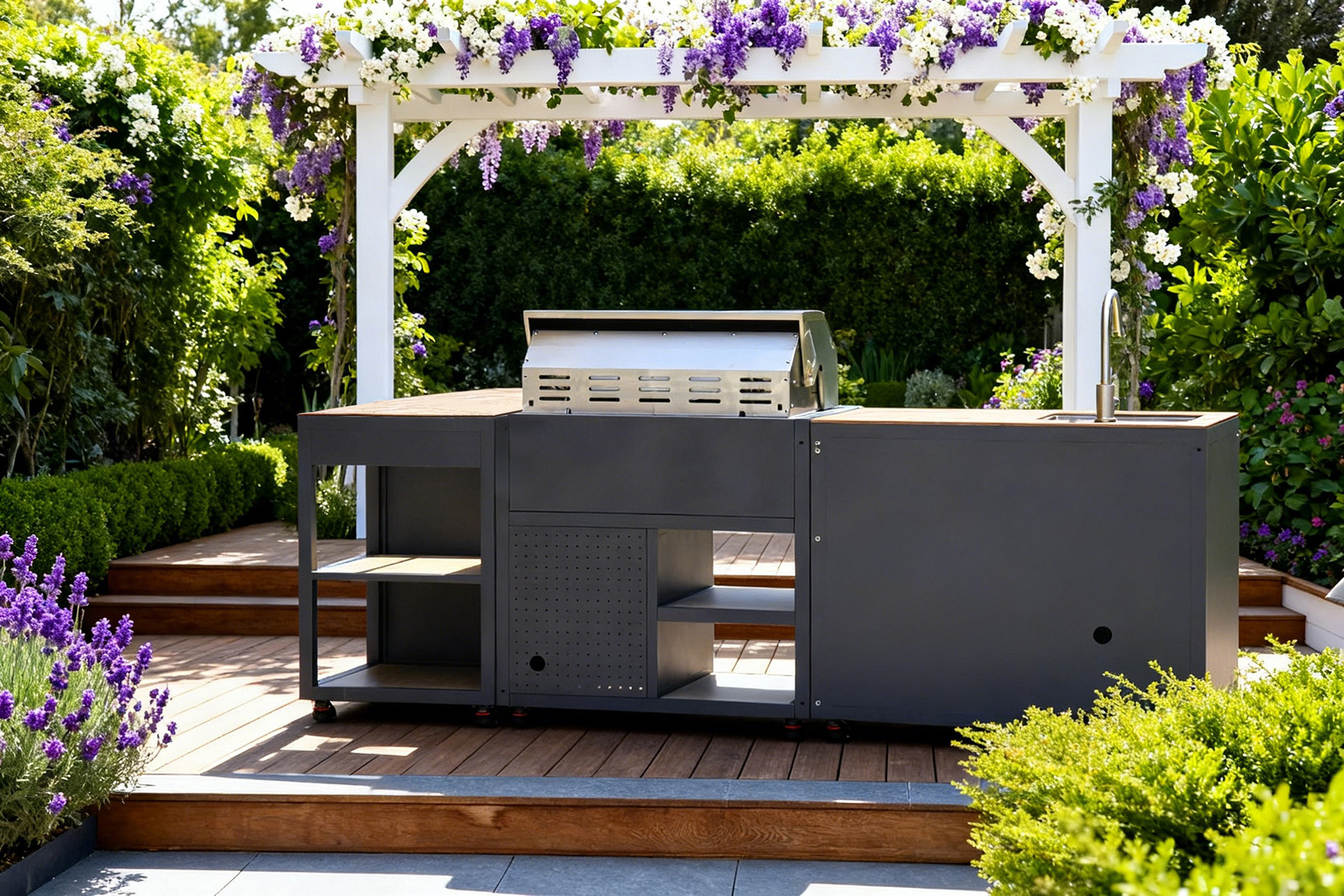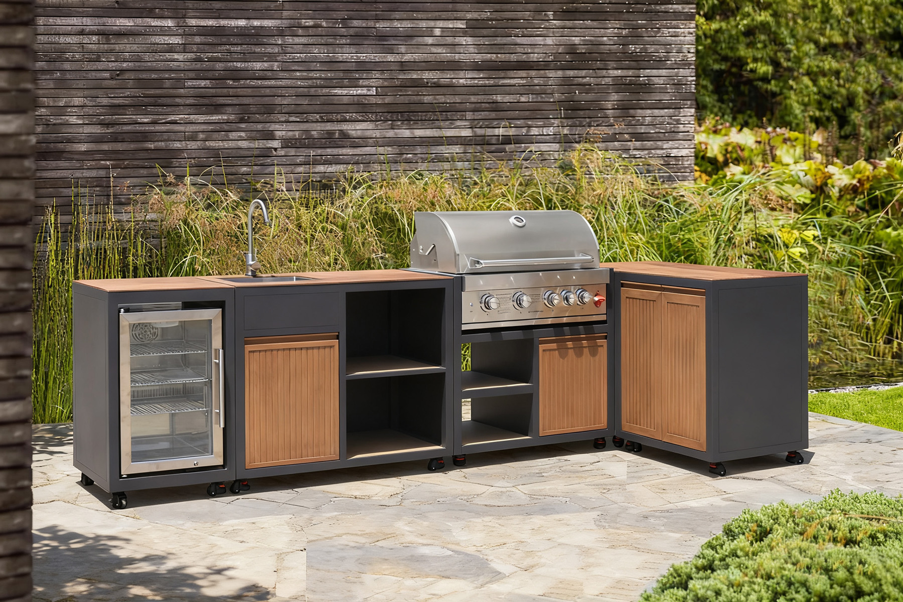 Integrated Refrigerator: A dedicated refrigeration unit is included on the right side, perfect for cooling beverages, storing perishables, and reducing trips indoors.