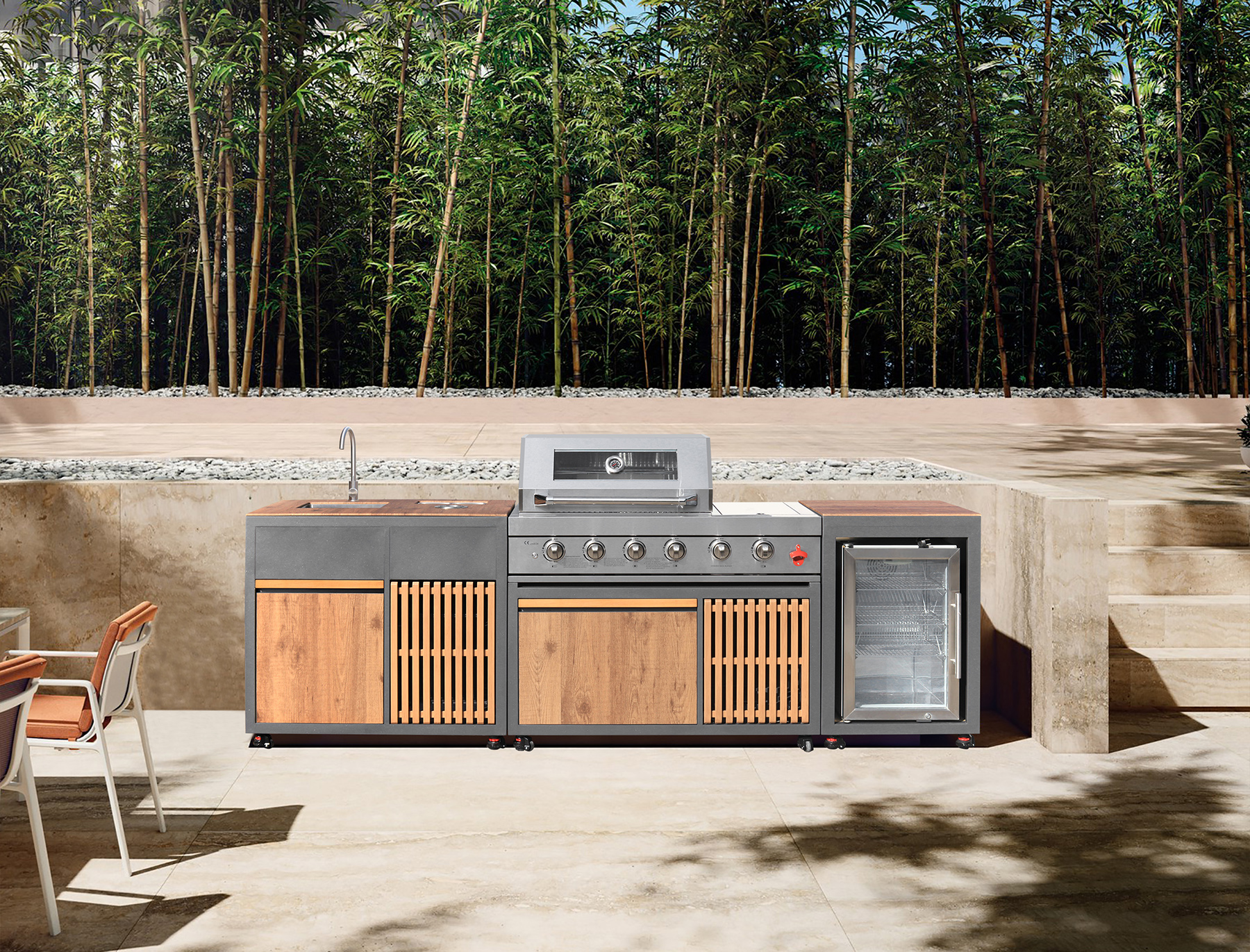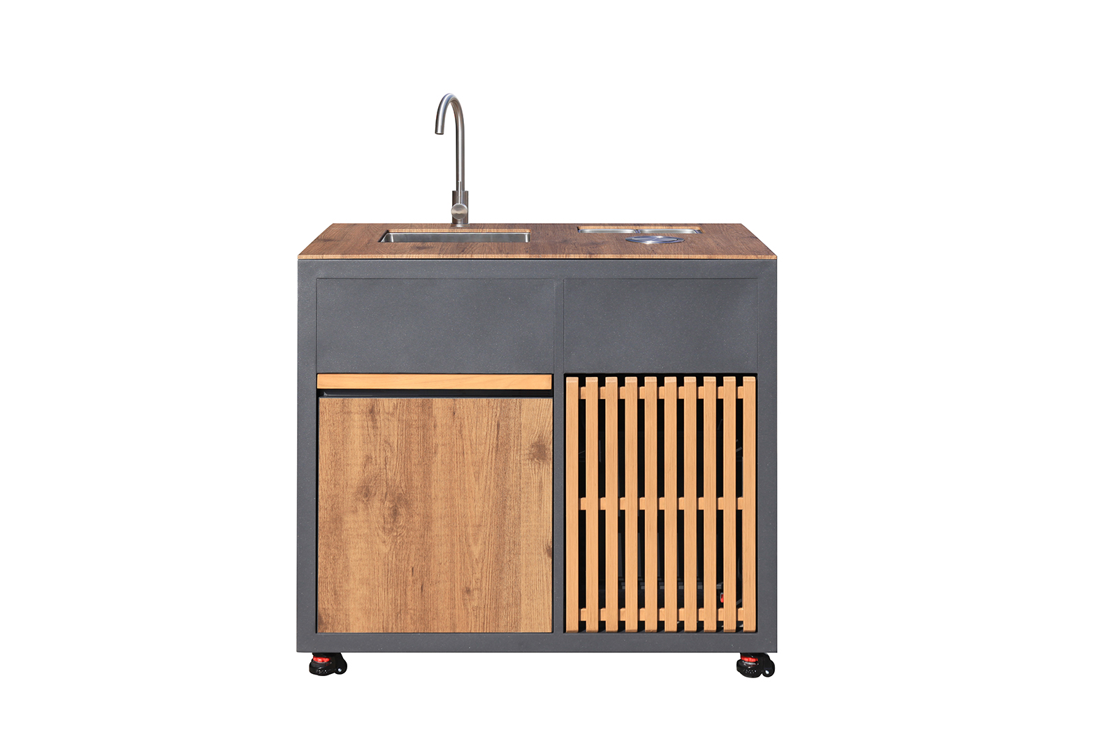 Integrated Refrigerator: A dedicated refrigeration unit is included on the right side, perfect for cooling beverages, storing perishables, and reducing trips indoors.